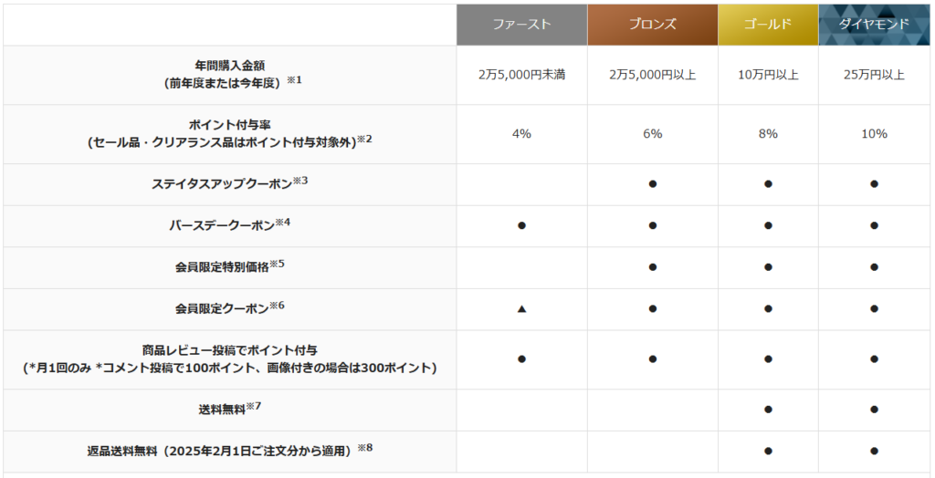 会員のステイタスが高いほど、サービス内容がグレードアップしていきます。